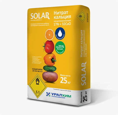 Применение нитрата кальция способствует повышению устойчивости растений к стрессовым факторам среды, улучшает качество плодов и увеличивает срок их хранения. Наличие кальция в доступной форме необходимо в течение всей вегетации, т.к. данный элемент не перераспределяется внутри растений. В открытом грунте кальциевая селитра - отличное решение для кислых почв.